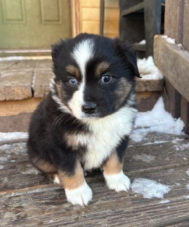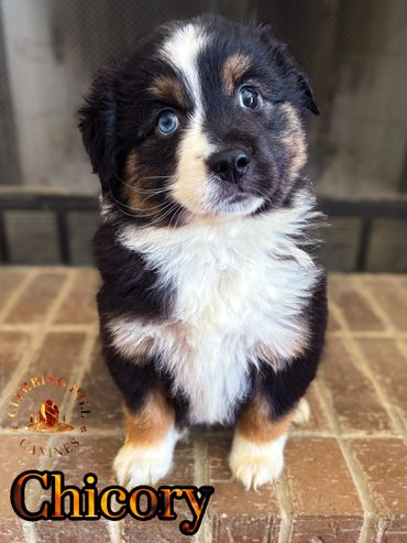 Chicory is a gorgeous black tri male with an awesome blaze! Chicory is looking to have a really nice build so far, one of the biggest in the litter.